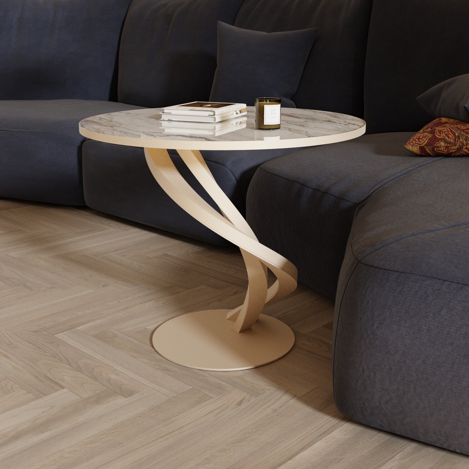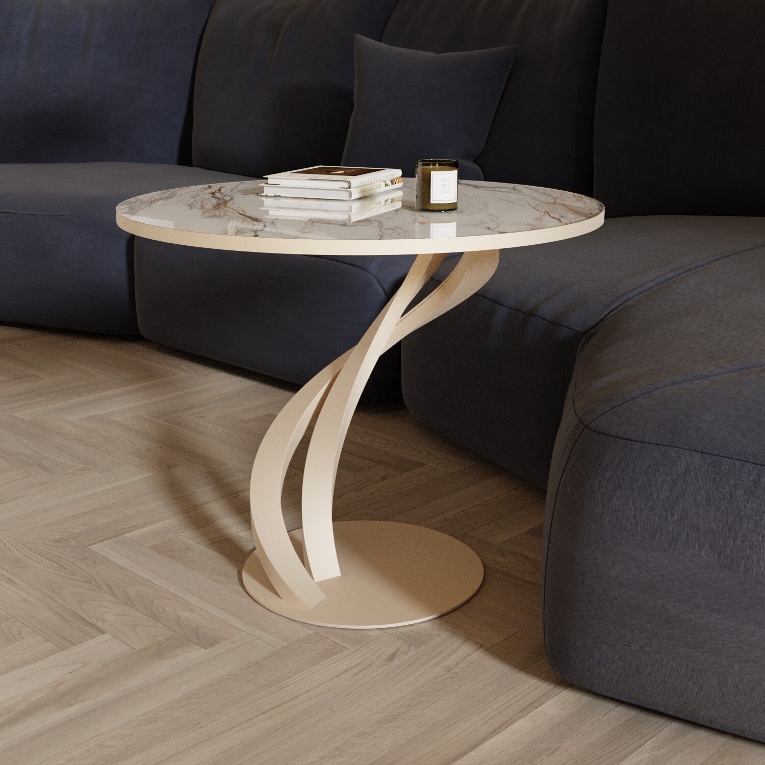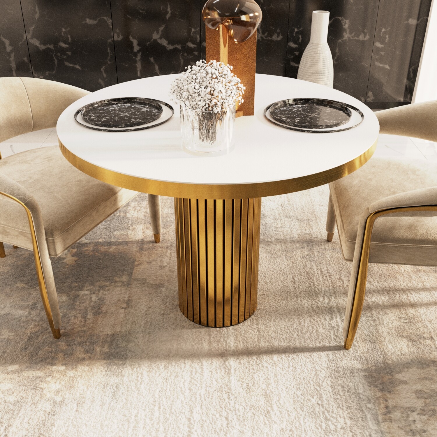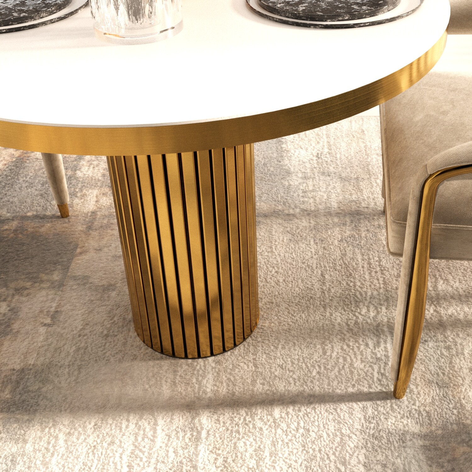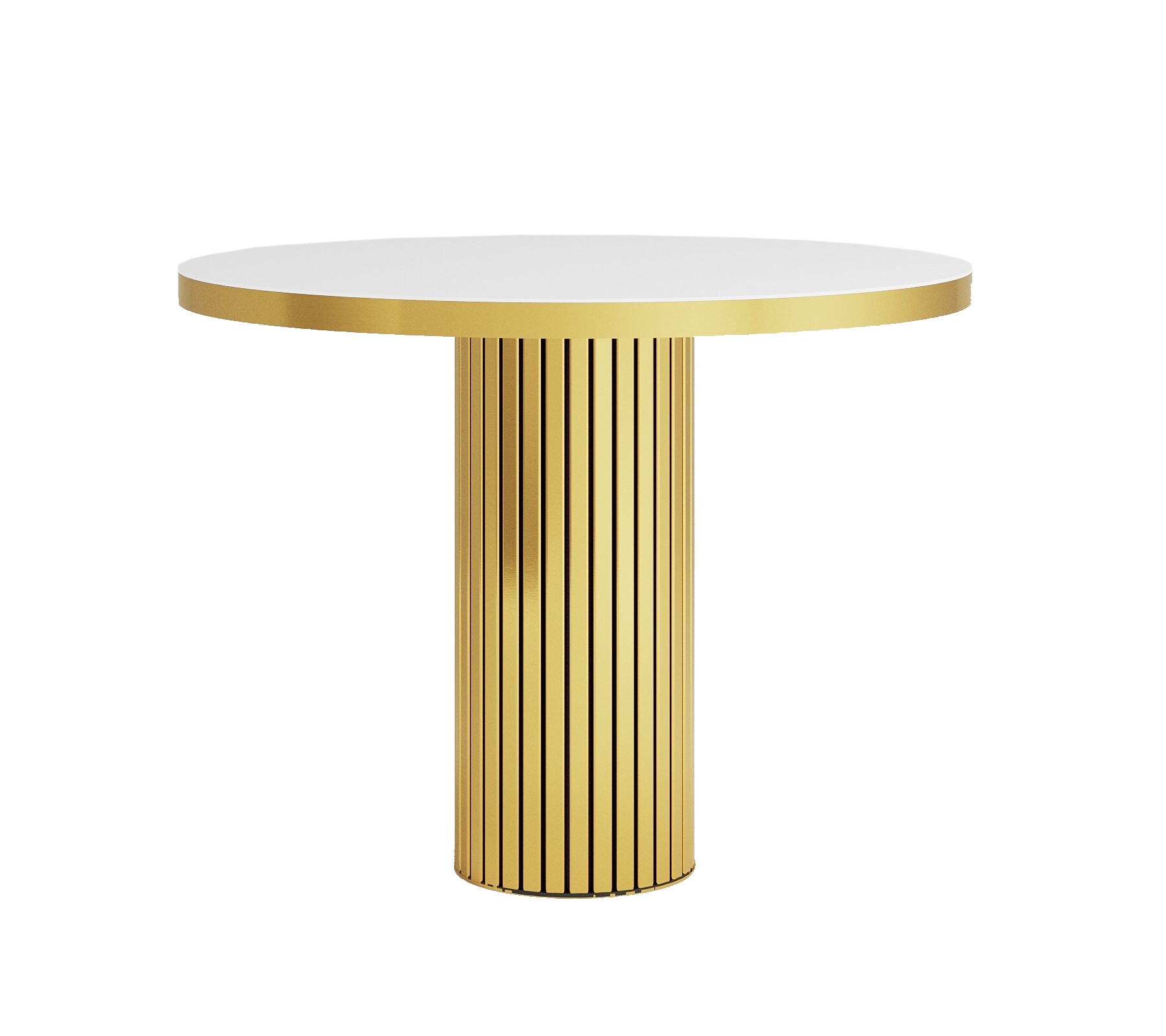 Цвет столешницы белый матовый. Цвет кромки: золото латунь. Высота кромки 5 см. Цвет подстолья - блестящее золото. Столешница: МДФ с покрытием из hpl пластика. Опора: гальванизированный металл с напылением золотого цвета.